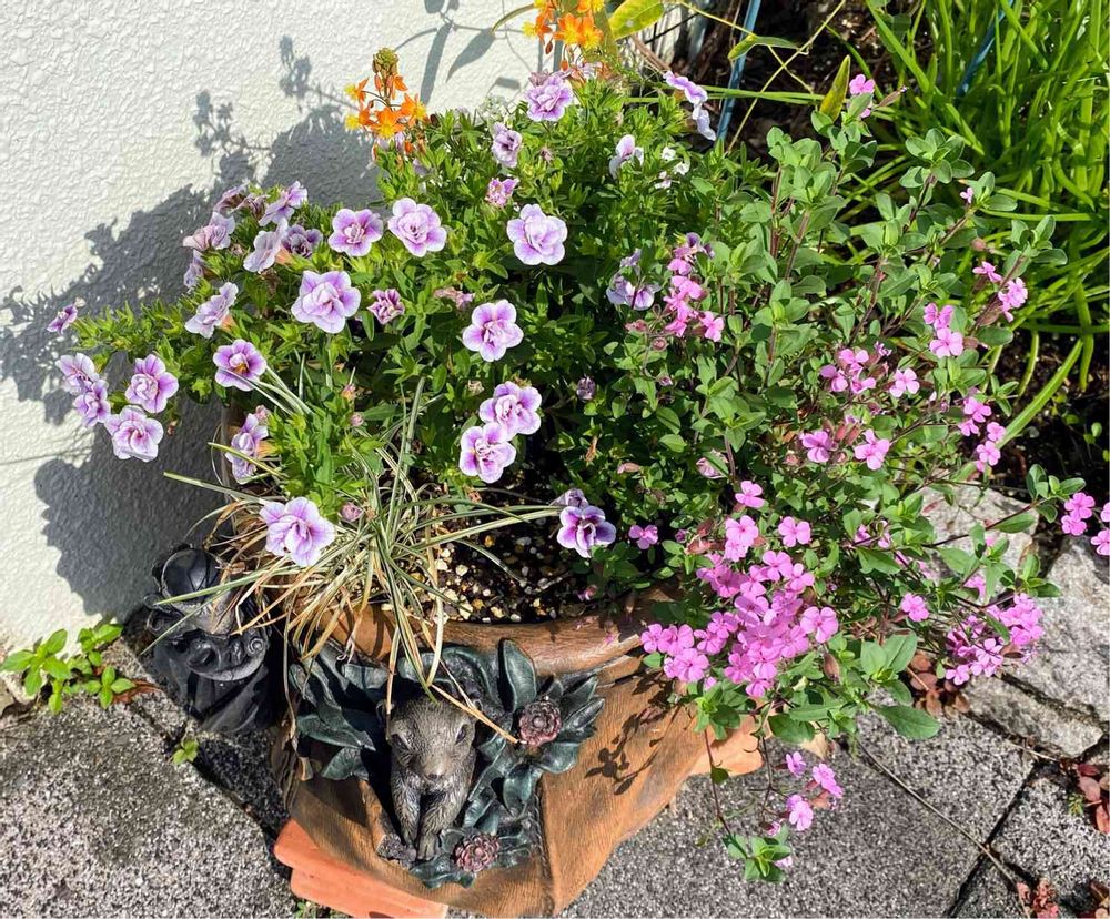 リスさん鉢のサポナリア オキモイデスがまたたくさん咲いていました♡ カリブラコア ウノダブル グレープフリルといい感じ♡