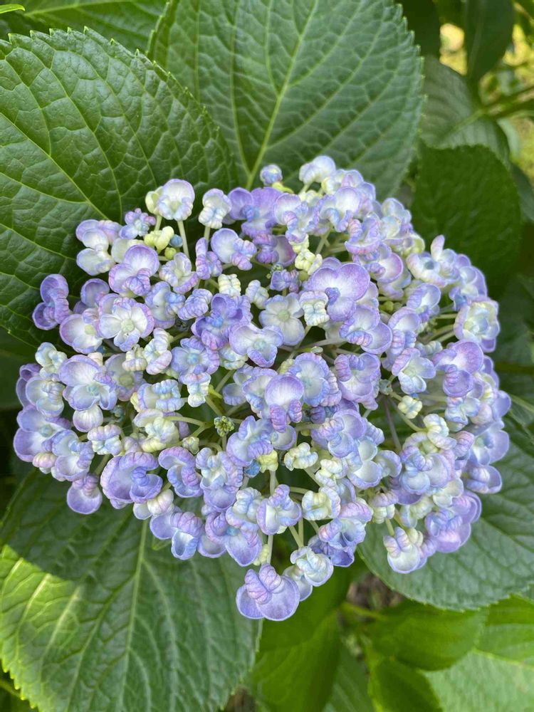 うず紫陽花が色づくのが遅いのか木の下で影なので色づきが遅いのか他の紫陽花より遅いです