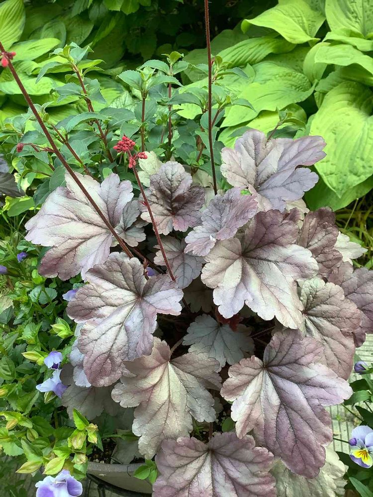 🌸ヒューケラドルチェ シルバーガムドロップ🌸屋外で冬越しした2年目の株です。きれいな薄紫色の葉が、光の加減で金属みたいに光ります。