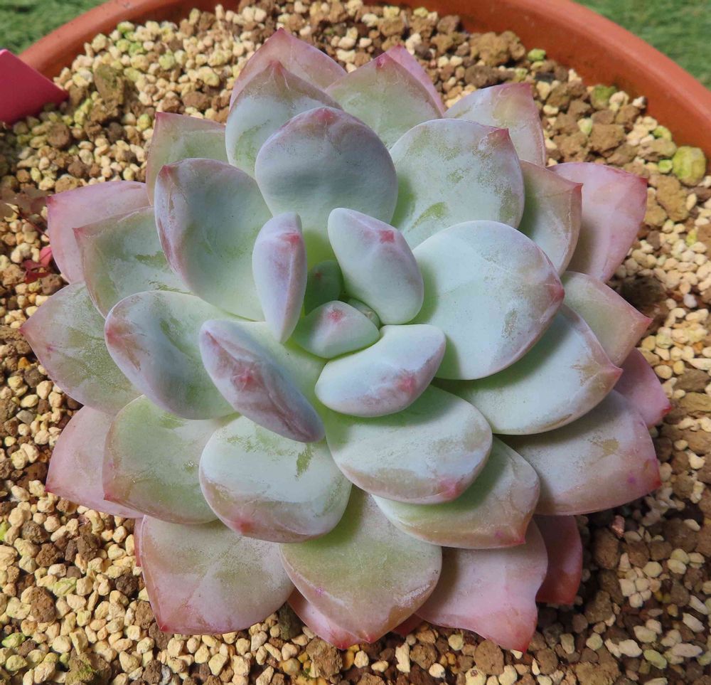 このところよく投稿する白い粉をふくエケベリアの一つのソンヨウン。粉はまだこれからと言ったところで,本来はもう少し白かったはず。