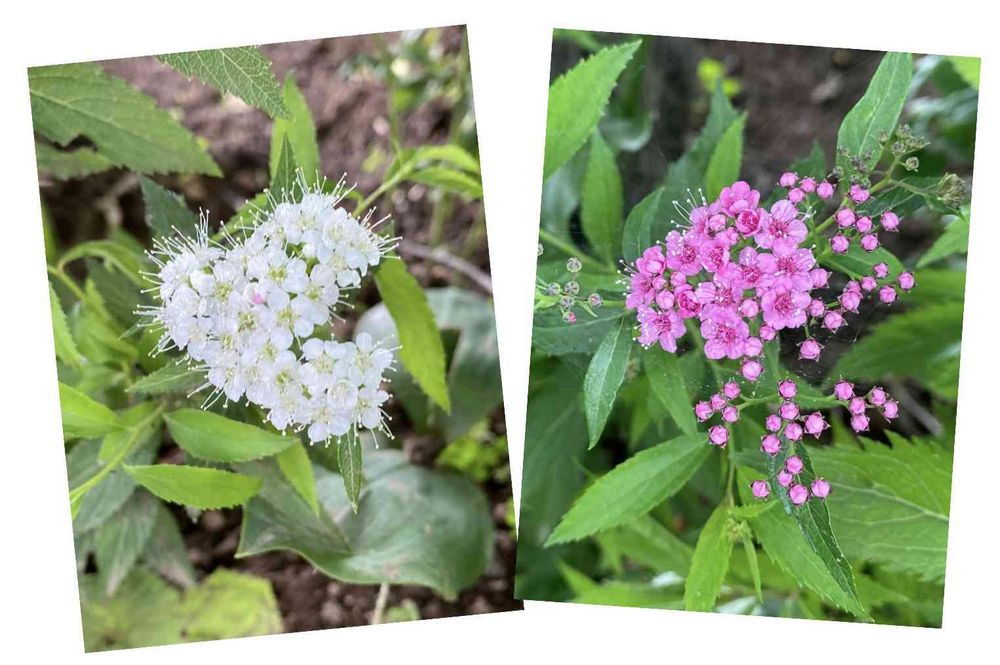 私もホーリーさんにいただいたシモツケが、白とピンク2色の花をつけてくれました。