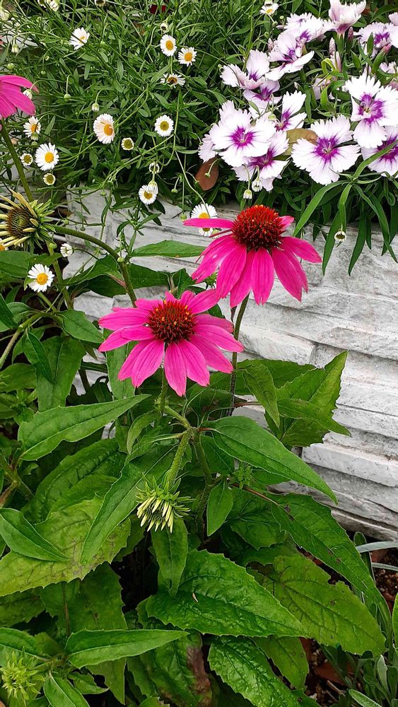 コンテナ前に地植のエキナセアパウワウワイルドベリー‼️株もどんどん大きくなりお花も3輪咲きました😃蕾も沢山で昨年始めてお迎えして冬も越してとても優秀です👍