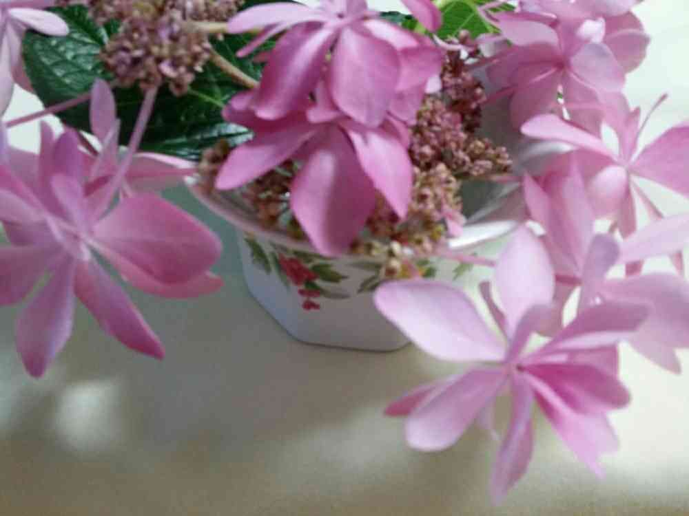 窓辺の紫陽花が強風で倒れて1本折れてしまったので切って花瓶にさしました。