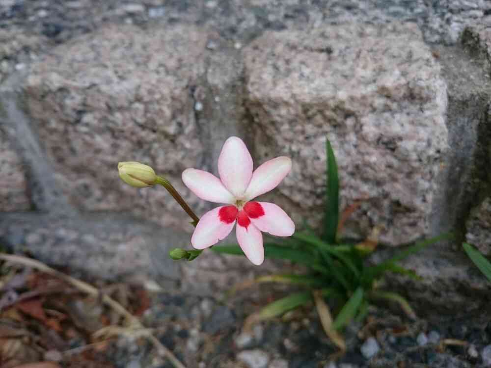 コンクリートの割れ目に落ちたこぼれ種から育ったヒメヒオウギアヤメが1輪先駆け。小さくて毎年楽しみなお花です。