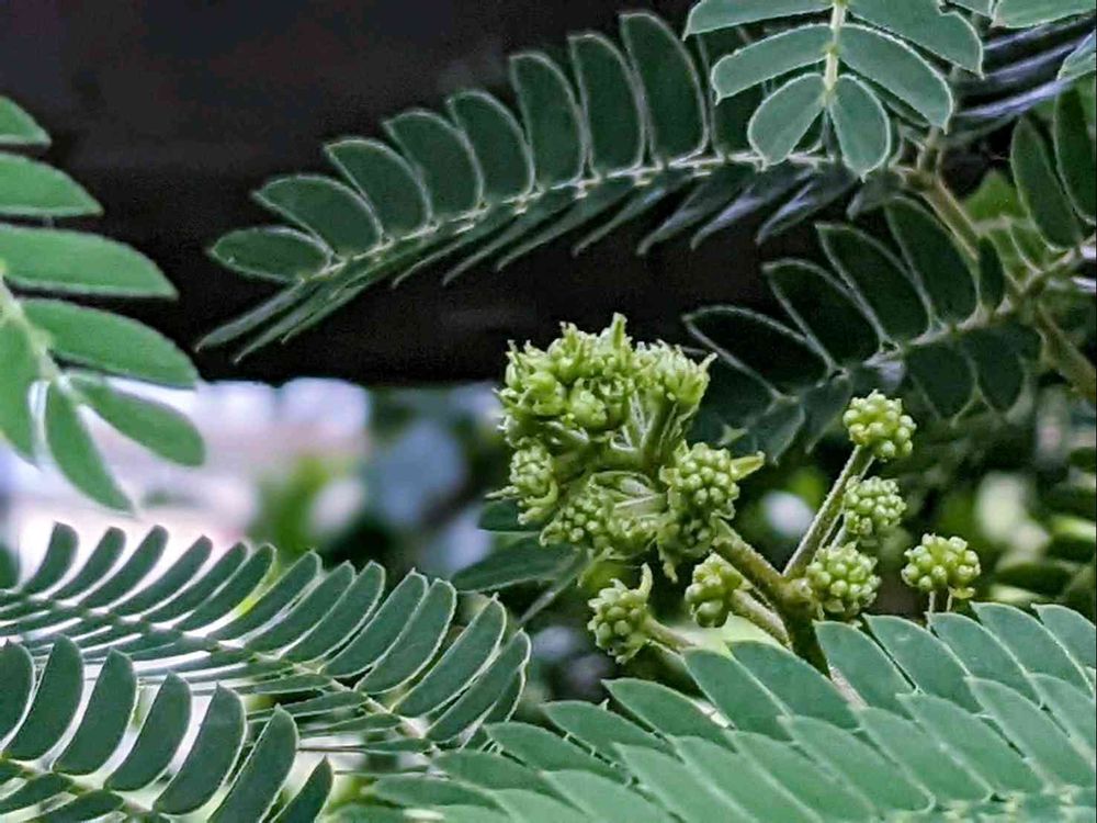 昨日の「今日のお花」 アプローチの枝垂れ合歓の木には素敵な葉に囲まれてこんな蕾もありました