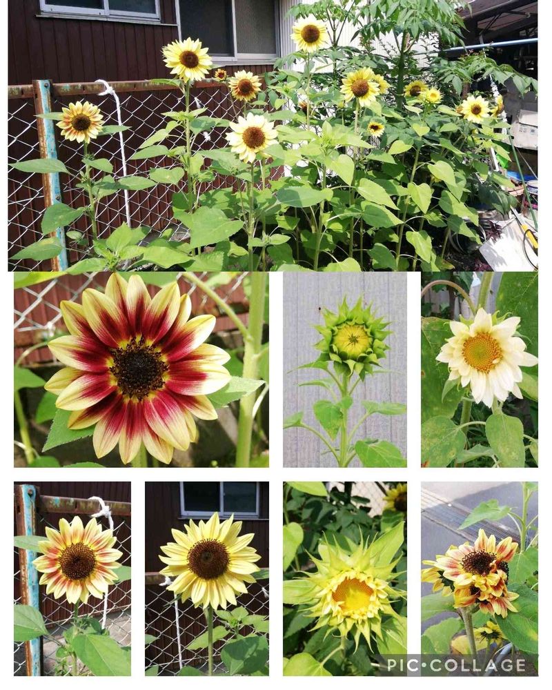 お早よう御座います。 梅雨入り直前の今朝、多肉達の梅雨対策で外へ出ました。賑やかに咲いた向日葵が目に入り、我が家の今年の向日葵の各色が出揃った様なので投稿しました。一際変わったのが右下の写真です。一頭に6個の花が着いておりとても窮屈そうです。