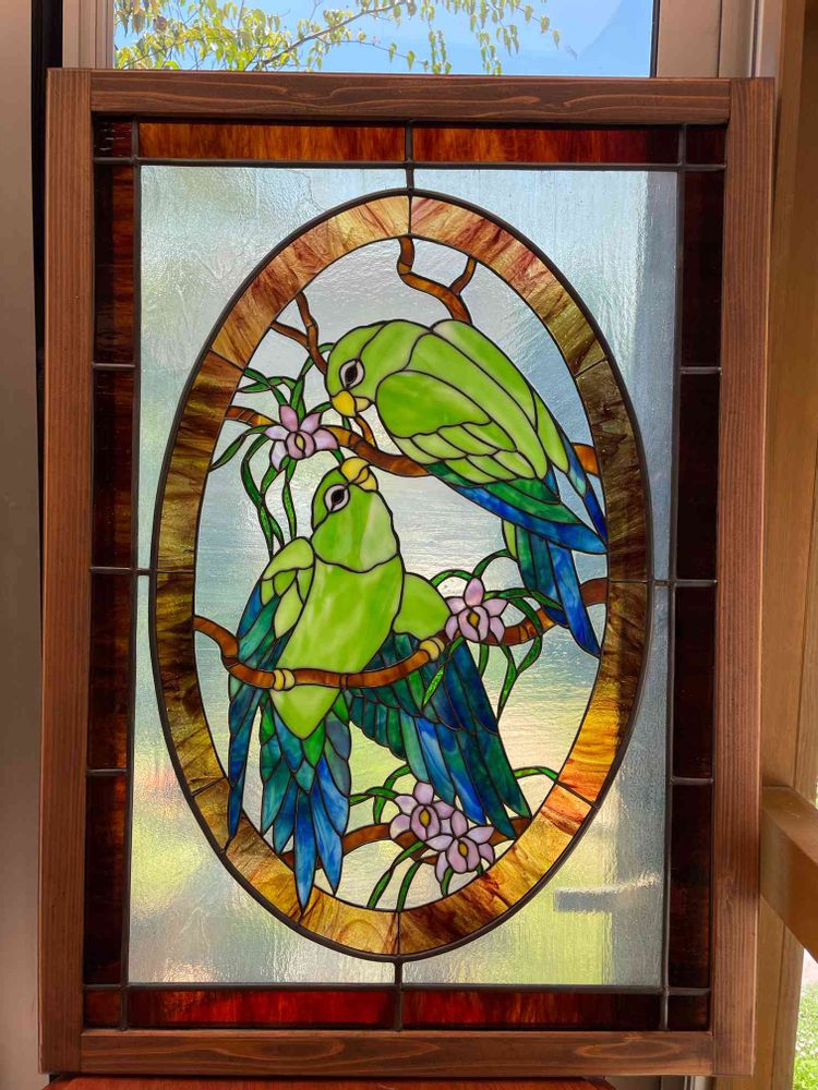 木目調のステンドグラスがまたステキですね〜。趣味が大工の旦那様、ウチにも欲しいです‼️