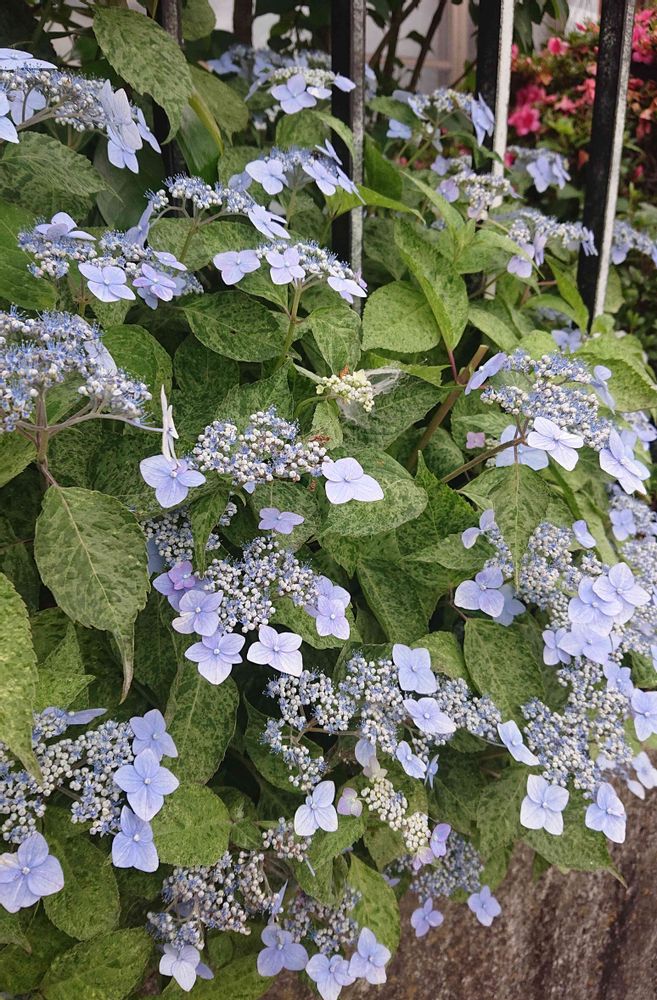 フェンスから外向きで咲いてる斑入り山紫陽花、九重山(クジュウサン)