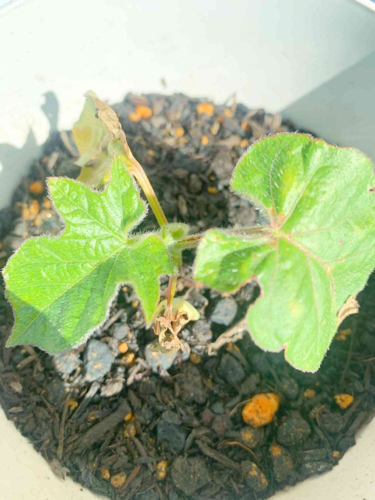 学校から苗をもらってきた時に傷になってた、最初に出てきたであろう2枚葉っぱの内、1枚は完全に立ち上がれなくなってしまった、、
