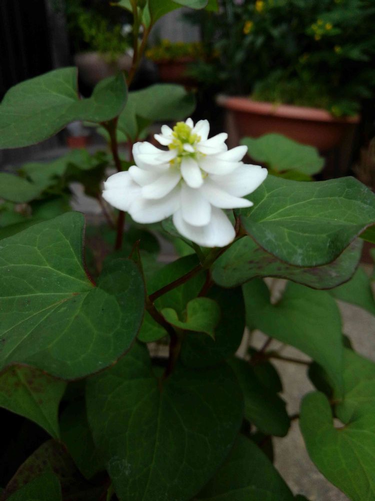 ドクダミを嫌う人は多いけど…私は純白の花が咲いて好き❗️八重咲きは初めてです😁
