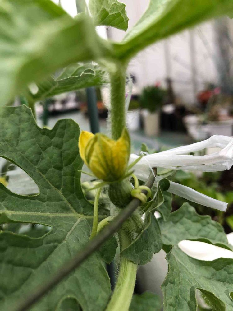 こだまスイカの雌花、受粉させる事ができるか?屋上菜園へ行くには、階段修繕工事中でなかなか行きにくいんですよね😥