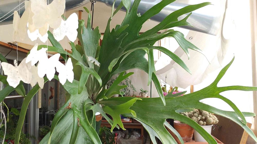 ビカクシダ ネザーランド とにかく重たくって、うっかり落とすミス⤵️💧 ポットに亀裂が入り植え替えを余儀なくされていますが、さてどんな鉢にするべきか… あちこち移動させてしまうのがいけないのだと思うけど、こう大きいと、狭いベランダなので動きが取れなくて💦