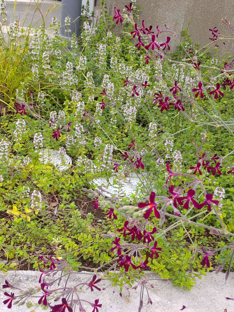 赤いベラルゴニウムの奥に咲くグランドカバーになっている白っぽい花は何でしょうか❔