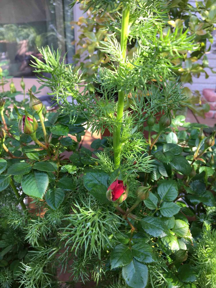 寄せ植えにしたミニ薔薇とチドリソウ、カモミール、あとはなんだったかな?冬に適当に小さな苗を植えておいただけ。蒸れてしまいそうなぐらいモサモサです。💦💦