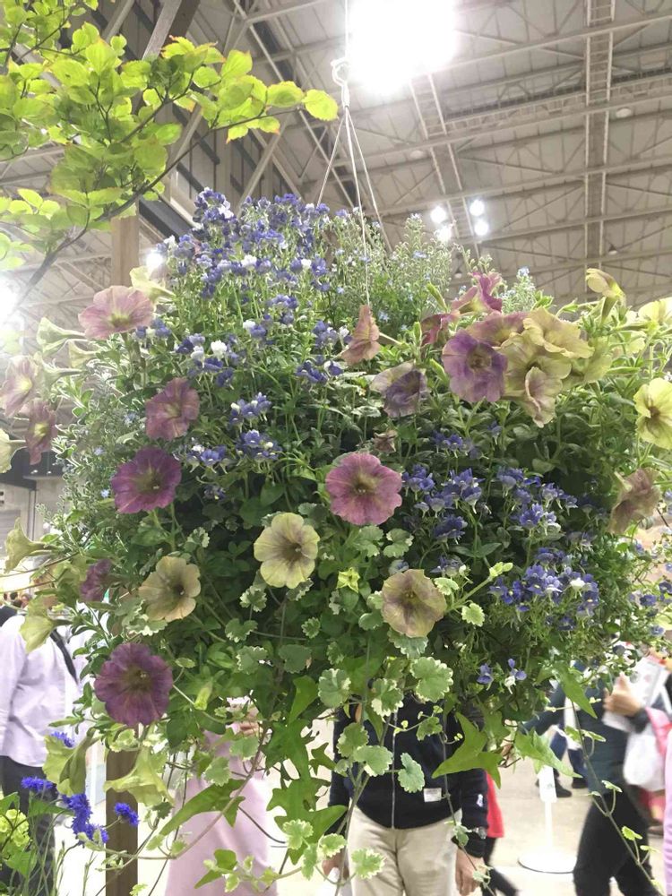日本フラワー&ガーデンショウのコンテストのお手伝いに行って来ました。ミニガーデン部門に素敵なハンギングバスケットがありました。フンワリとしてペチュニアの色もウットリです。