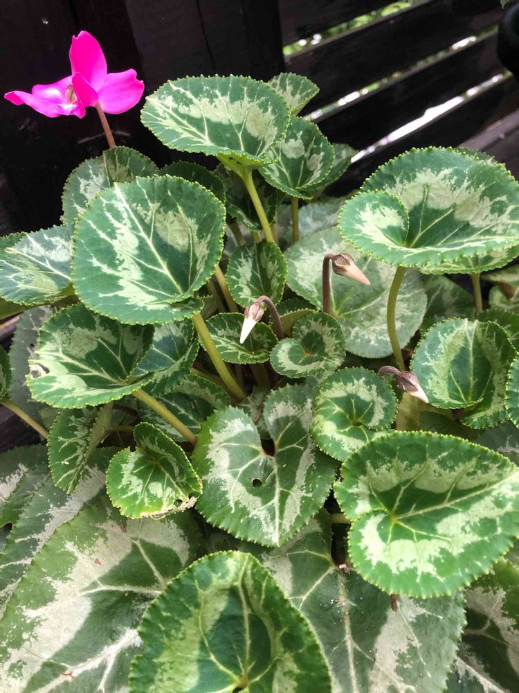 花の休憩場所で夏越し中のはずの、シクラメンに蕾が上がり、花までも。