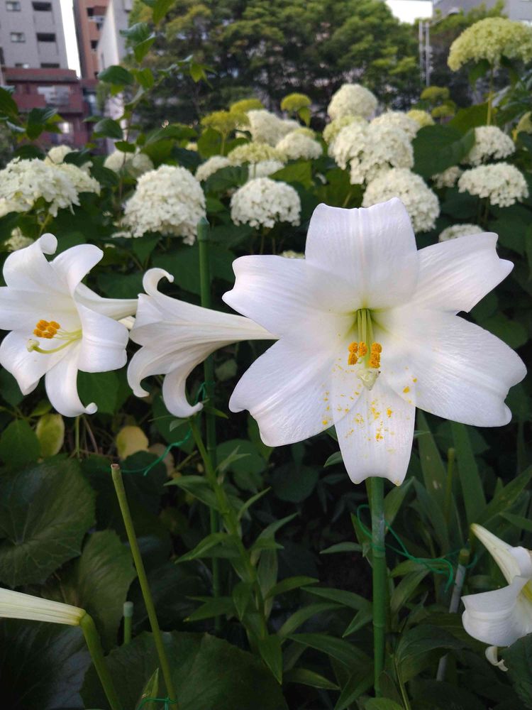御池通りにたくさん咲いている🌼アナベル🌼をバックに、🌿テッポウユリ🌿のお花も咲き始めました🤗🎶💗
