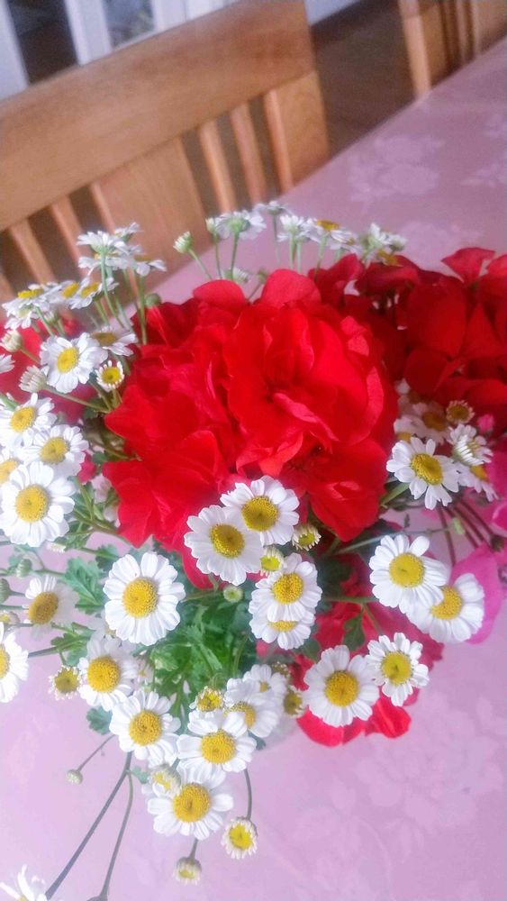 今日は午後から雨が降ると言うのでナツシロギクとゼラニウム食卓に生けました😃🌸🌿