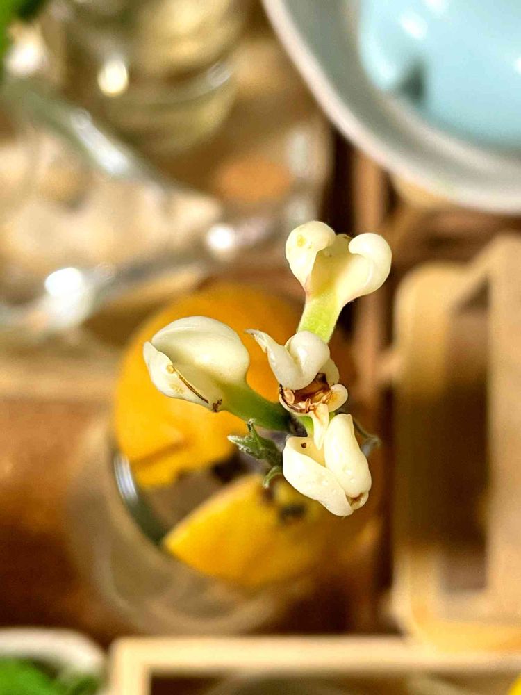 が、今回のこの子は、なかなか発根も発芽もしなかったので水にほんの一滴、メネデールを入れてみたのですが、そしたらぐんぐんと根粒みたいなつぶつぶ付きの根を生やし、葉っぱを差し置いて、このようなお花?みたいな物が咲きました…。写真で見るとアボカドのお花とも形状が異なるように見えるのですが、かれこれ2週間くらい咲きっぱなしです。