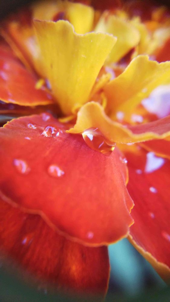 マリーゴルドのお花は割りと雨が降るとビショビショになってしまい雨粒撮影には向かないんですが、小雨ぐらいの降りだしたばかりの時に撮りました🎵