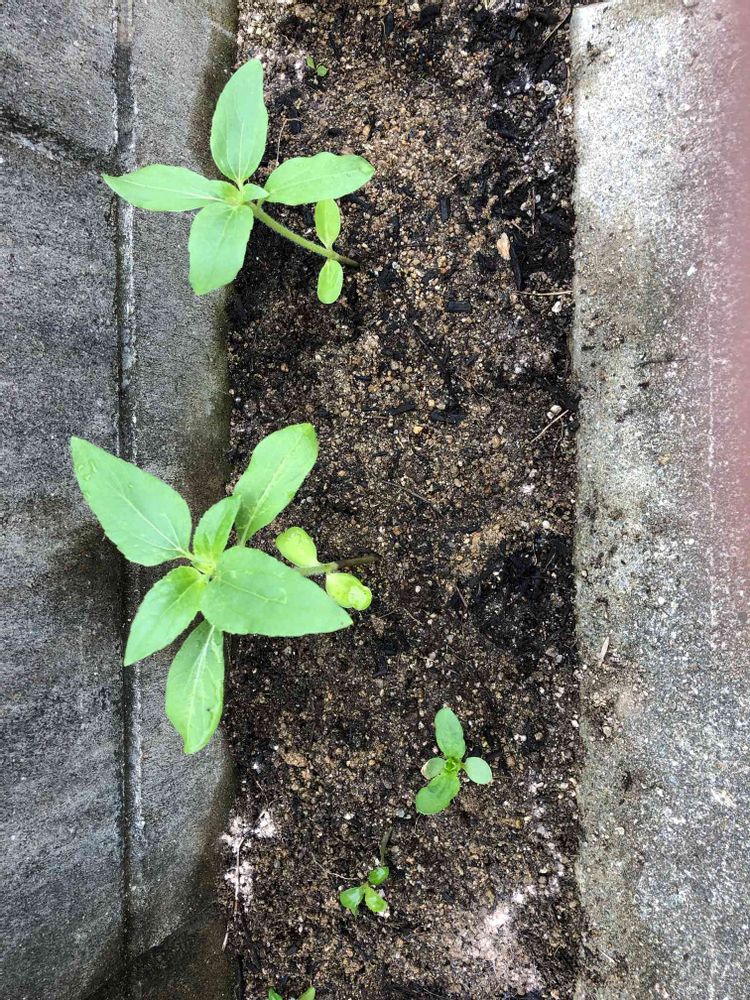 玄関側へ植えかえた子たち。こちらは北側?日当たりはそんなになのですが、ビオラさんたちのはけた後にイベントでいただいたひまわりのタネからの子。あとはリベンジ百日草タネからの子たちです。