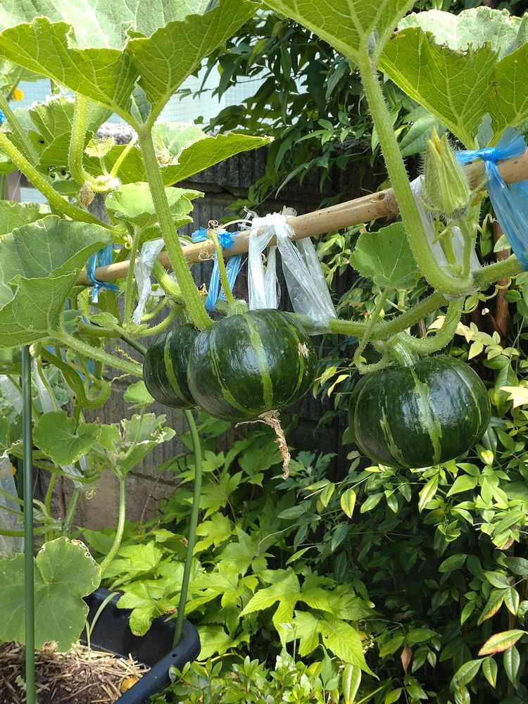 今年はミニカボチャにチャレンジし、一時は雄花、雌花のカップリングが出来ずどうしたものかと思っていましたが、3個が実りつつあります。