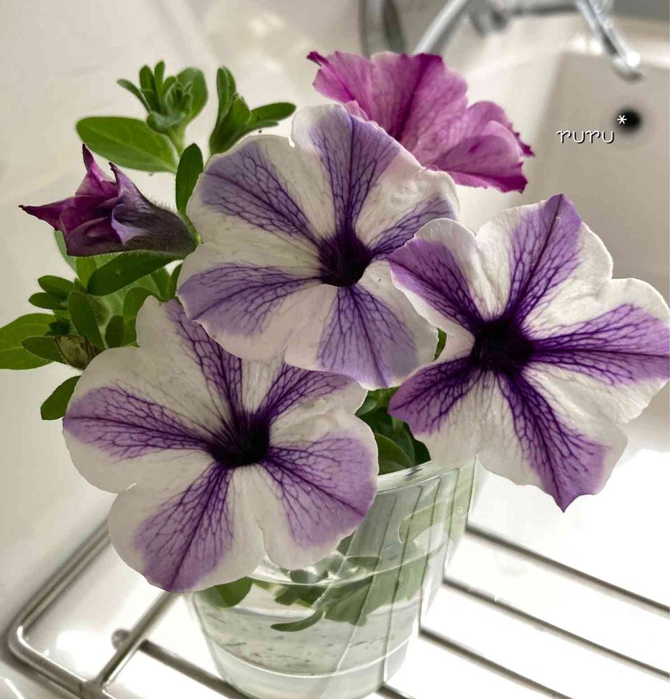 切り戻したペチュニアを洗面台に置いたら夫が「洗面台の花ってクレマチス?」と。
