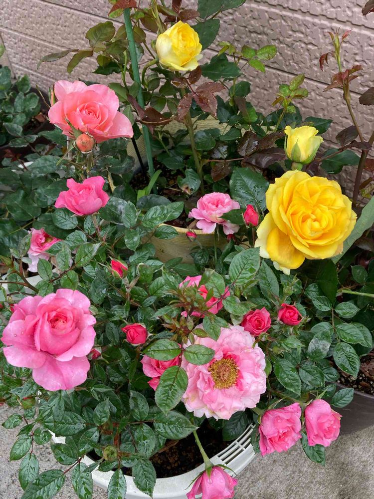 ミニバラ沢山の鉢にあちこち咲いているんだよ🎶