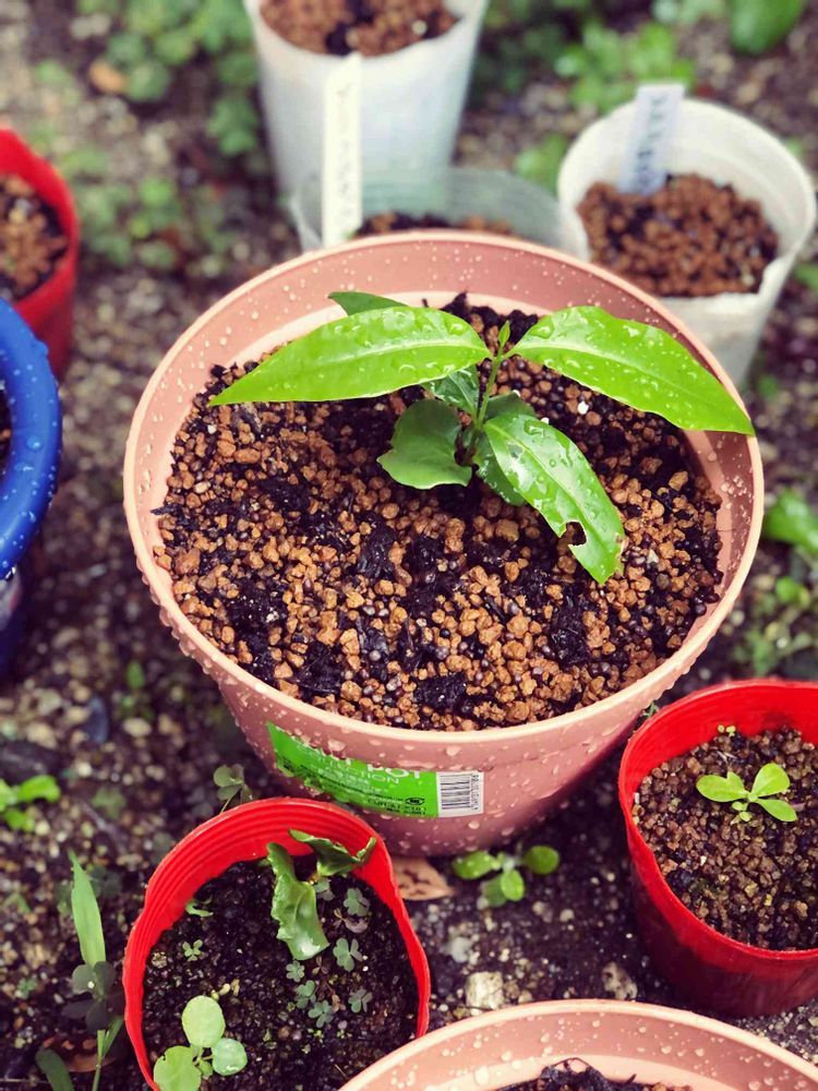 ロウバイの本葉が5〜6枚になったので少し大きい鉢に鉢上げしました。
