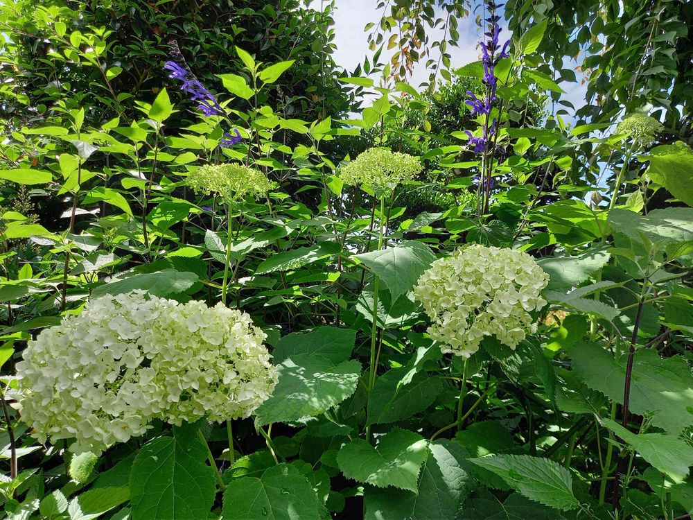 アナベル咲きましたね🤍💚メドーセージの紫とお似合いですね💜