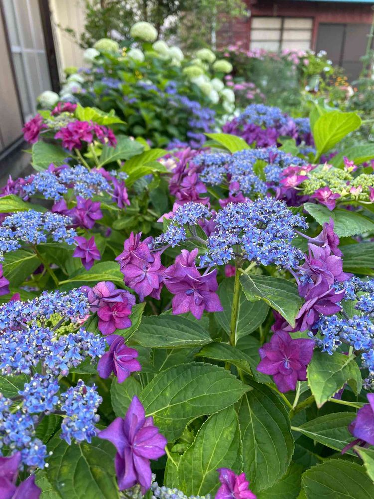 手前の紫の紫陽花は購入しま時は、赤でした!地植えにしたら