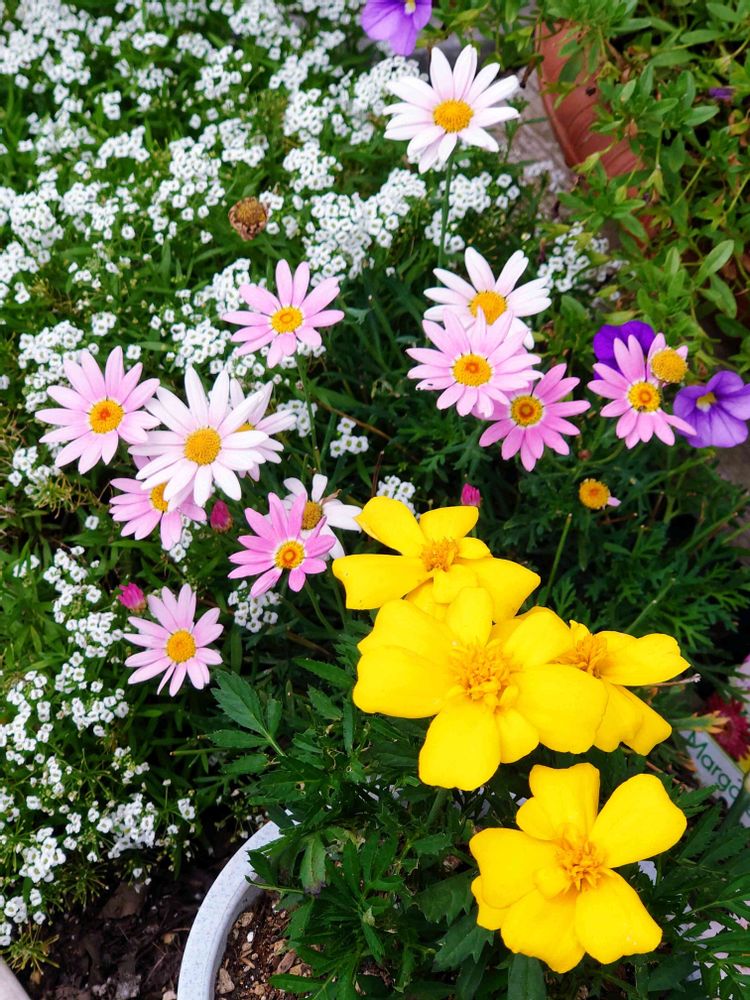 お出かけ先で素敵な組み合わせのお花「マリーゴールド」「マーガレット」「スイートアリッサム」に出会いました🌿💕🤗🎶