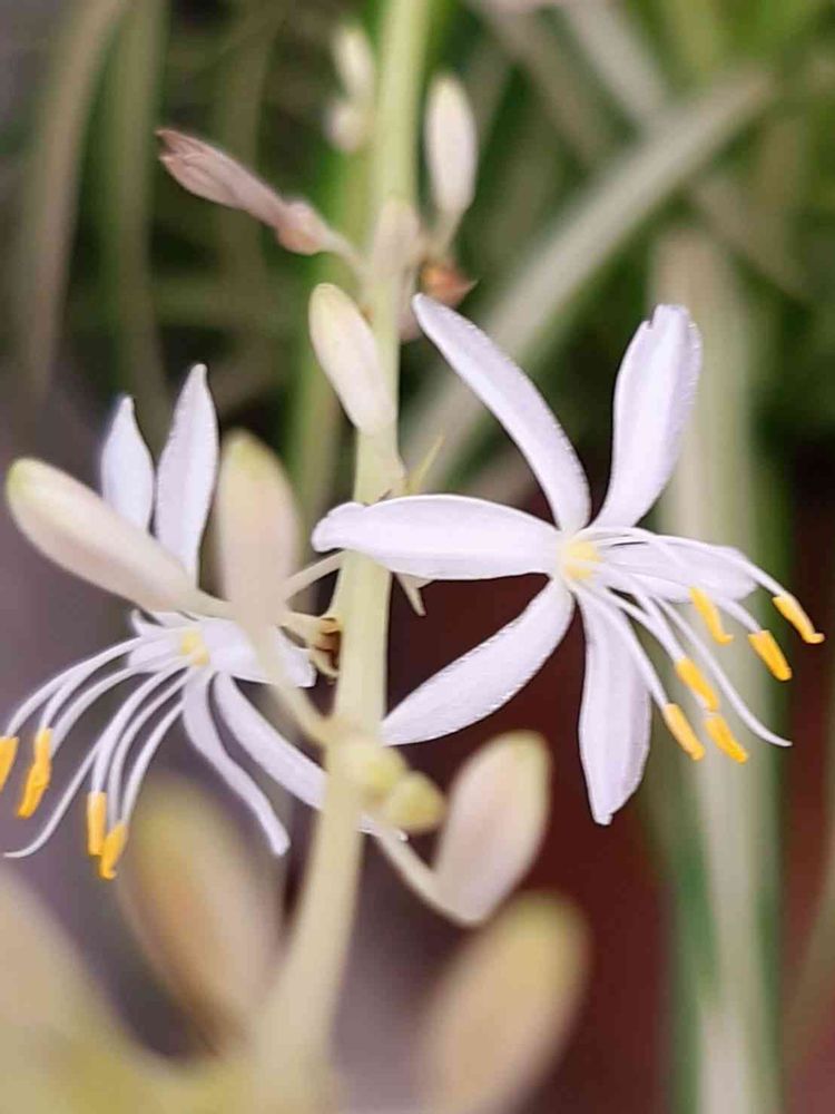 オリヅルランって観葉植物だと思っていましたが花が咲くのですね。可憐で美しいです〜