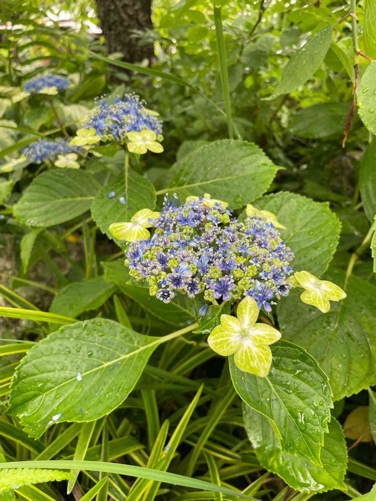 緑色の装飾花に青い宝石のような花が💚💙💚💙