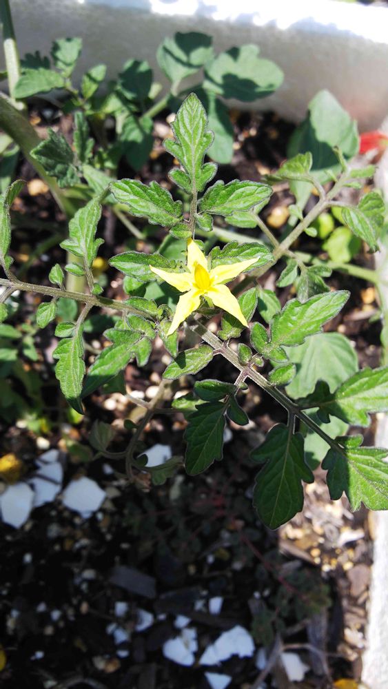 去年、育ててたミニトマトの実で地面に落ちた実を放置してたら、今年、芽が出て苗になって花が1つ咲きました😊