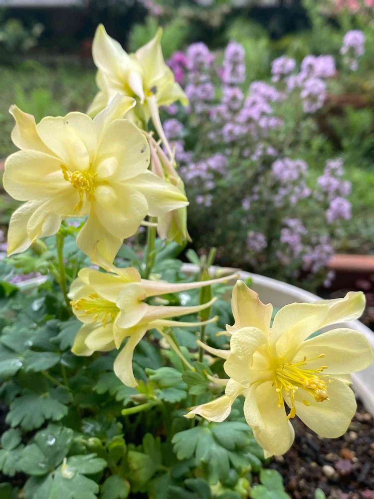 オダマキふわふわだけど、ほんと不思議な形だな👀後ろのピンクはタイム✨