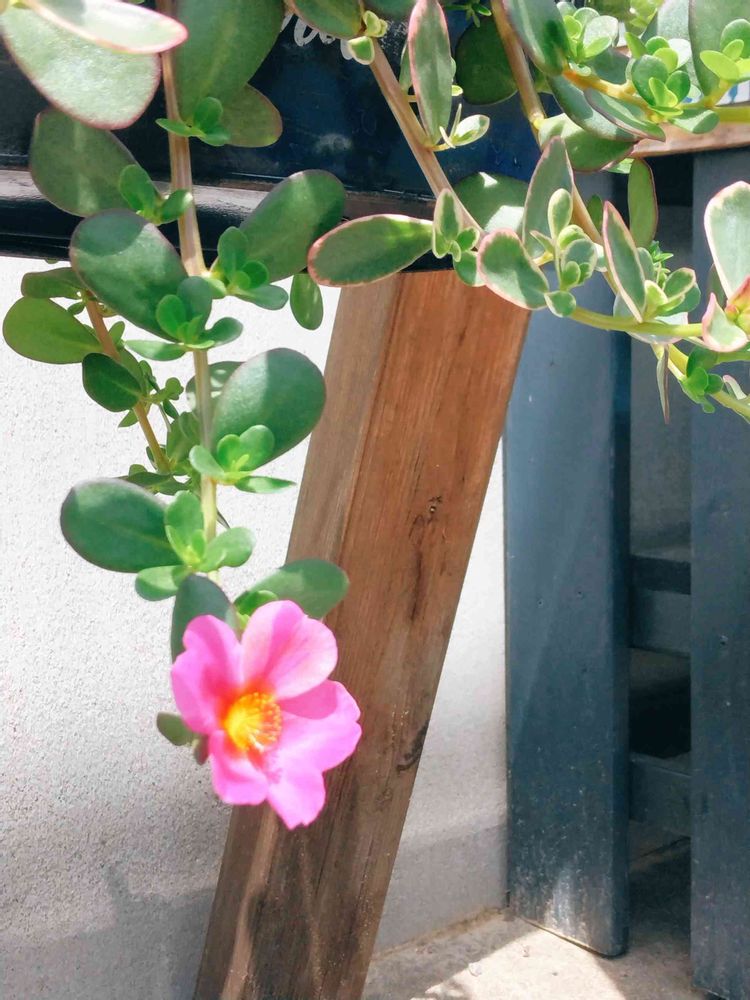 車庫の馬に寄植えしている🍀ポーチュラカ・マジカルビューティー🍀に、可愛いピンク色の花が咲き始めました💖