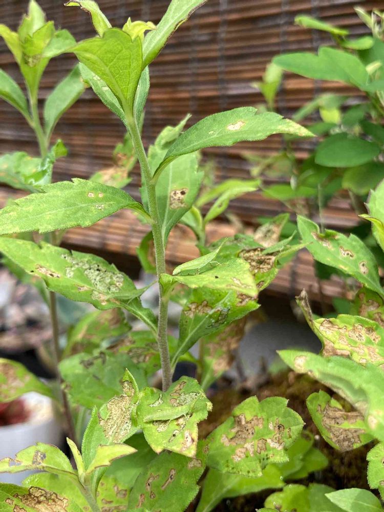 バッタの食害に遭っていますが、殺虫剤使いたくなくて放置しています。(中央に1匹いますよね)
