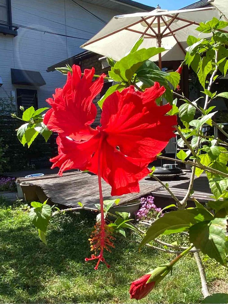昨日、出かけ先のとあるカフェの庭に綺麗なハイビスカスが咲いています😻