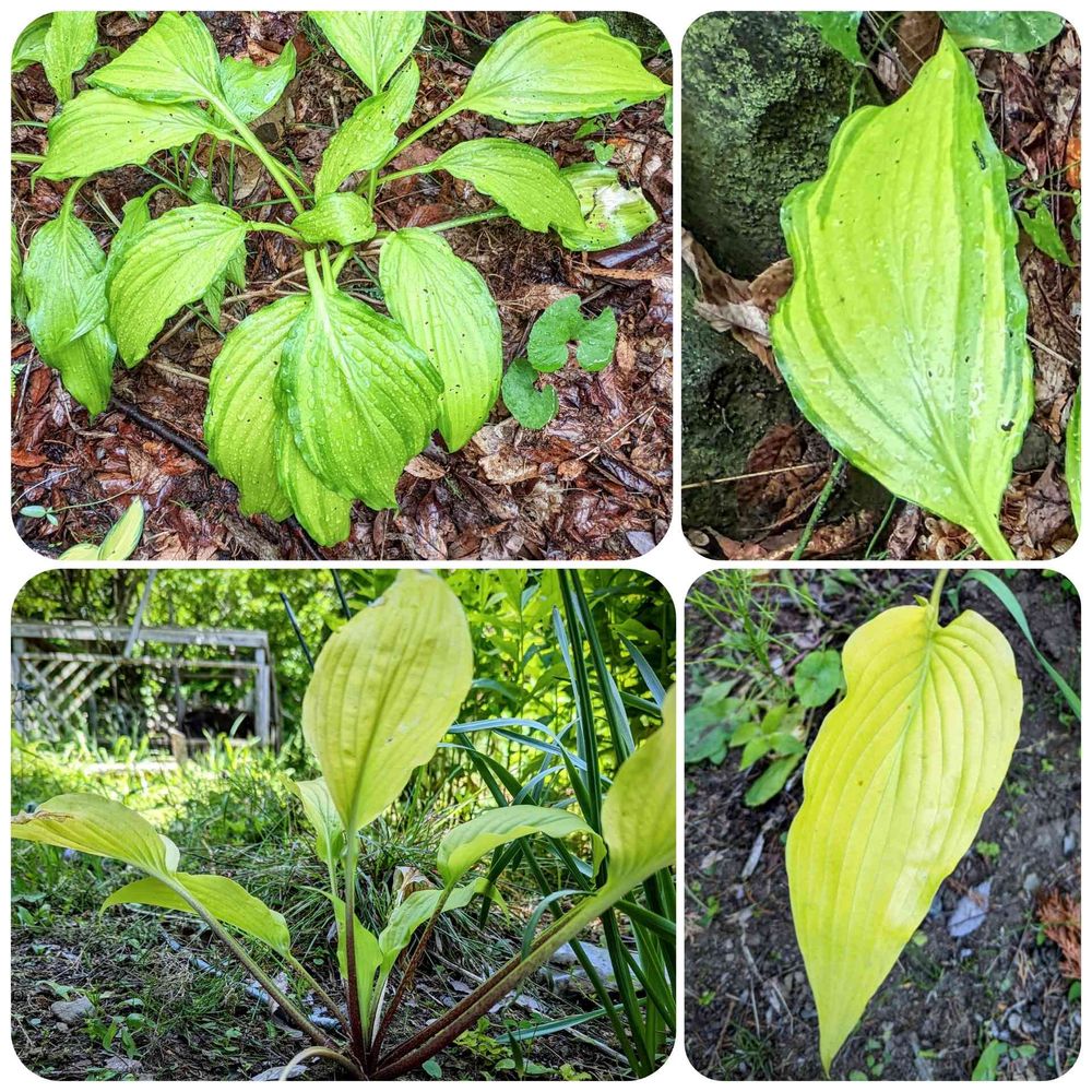 ヒロセゴールド、岩ギボウシの血を引いてると思われるホスタ。(茎に小豆色の斑点)下段の実生株にも茎に斑点があり、周りに岩ギボウシの血を引いたものが居ないので~このヒロセゴールドが親と思われます。実生株のバリエーションが増えて嬉しい実生株が発見できました。
