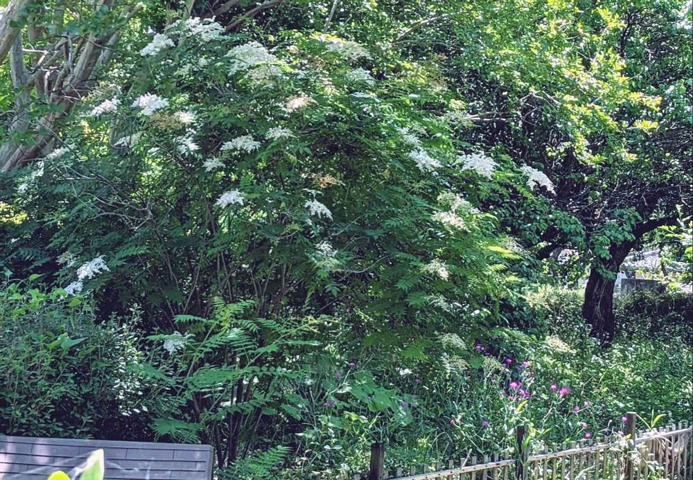デッキの端から見る優雅に白い花咲く庭七竈と ピンクの賑やかなフランネル草の景色です