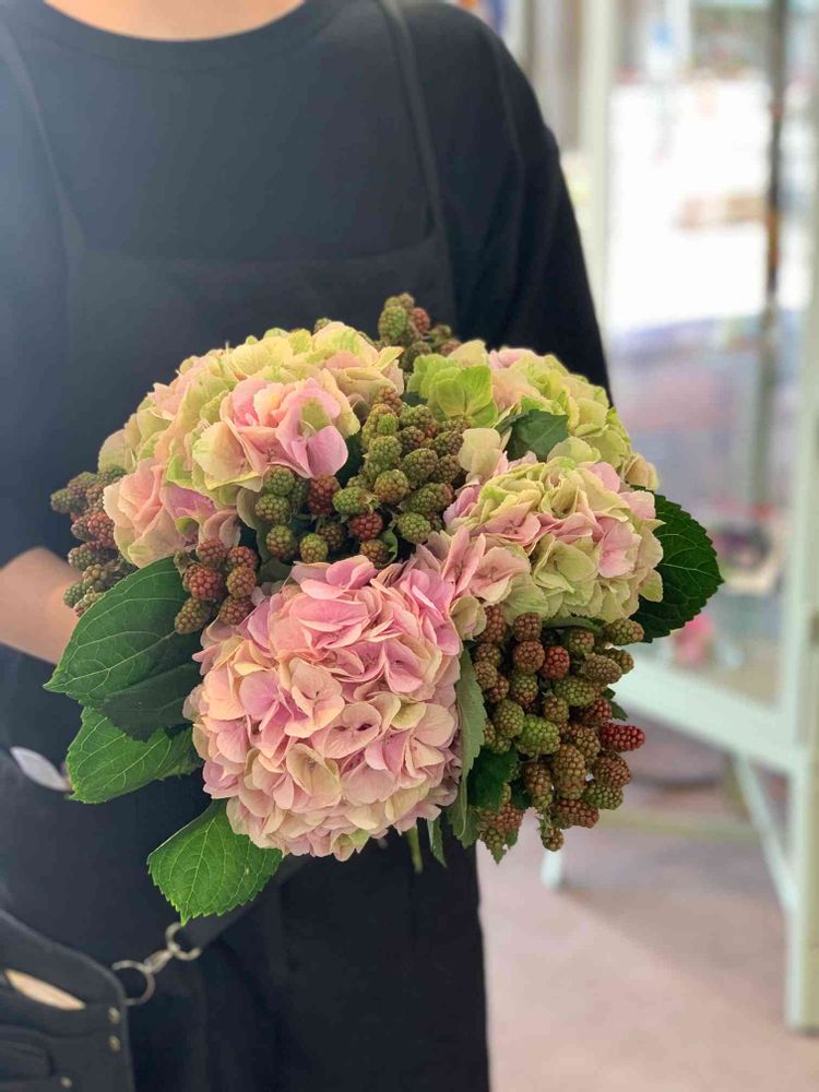 本日入荷のアジサイです❁︎ 生花担当ayaさんと可愛い〜を連呼☺️ 小さい頃良く近所で食べた桑の実も一緒に束ねたら、あら素敵✨