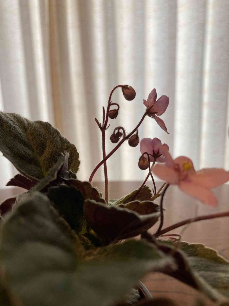 蕾の部分がくるくるしていて可愛らしいです。葉が肉厚でぷっくり、表面は産毛、裏はワインレッド。