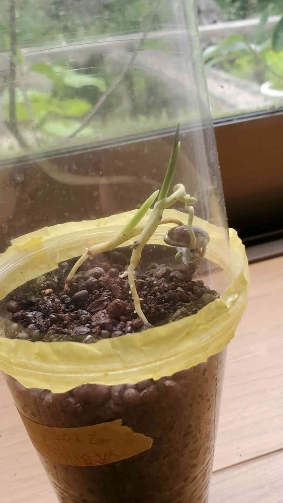 真下に芽が出てきたのも他にも複数ありますがいま出てるやつは比較的強くて、弱いのは発根前にカビたり、発根途中で温度が上がりすぎて腐ったり、いま温度とか中の水分もちょうどいいみたいで色も良くて枯れる気配がないです笑