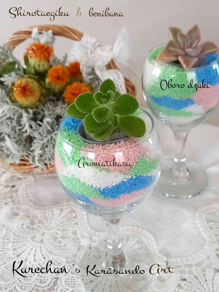 朧月とアロマティカスをワイングラスにカラーサンド アートに植えてみました