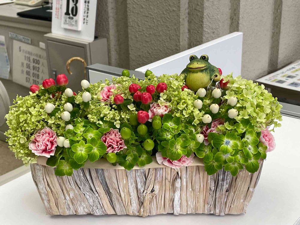 受け付けのお花その1変わったパターンでいいですね💗🐸さんが可愛い☺