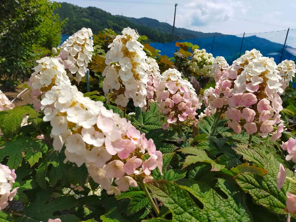 柏葉アジサイに薄いピンク色のぼかしが、とても優しい雰囲気で、かわいいですね〜✨🎶🌸まだこんなにモリモリに咲いているのですねー✨🎶💓
