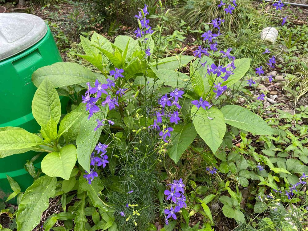 ここなら除草剤かけられないぞ!と言わんばかりにチドリソウに寄り添って生えてるヨウシュヤマゴボウ😅