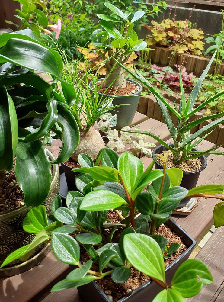 ペペロミア・フォレットは徒長気味、アデニウムにいたっては黄変が見られます。