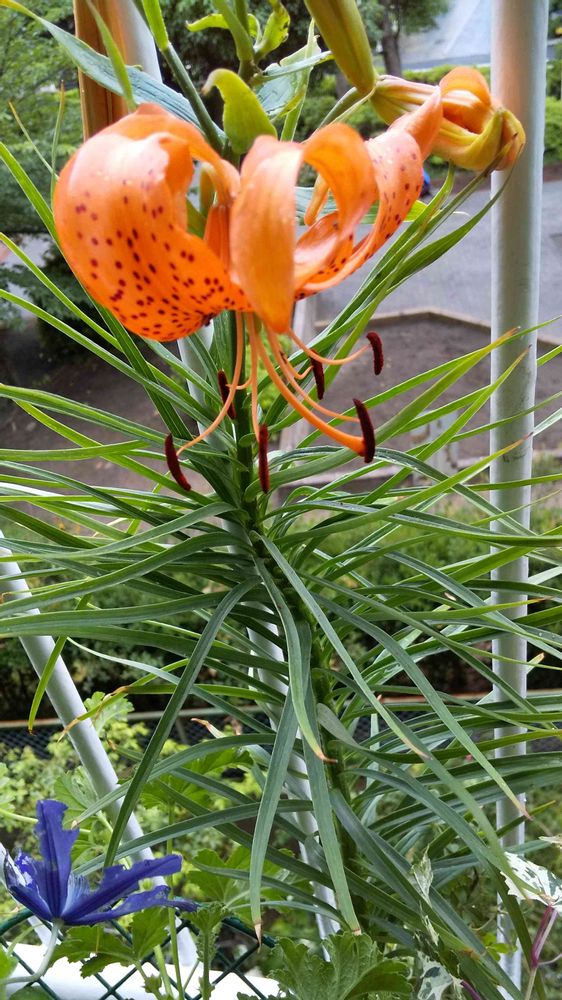 ベランダジャングル。3月に八百屋さんから食用のユリ根を、買って植えました。前に、おせち用に買ったユリ根と同じ花が咲きました。鬼ユリ、小鬼ユリ?これが食用のユリなんですね😃